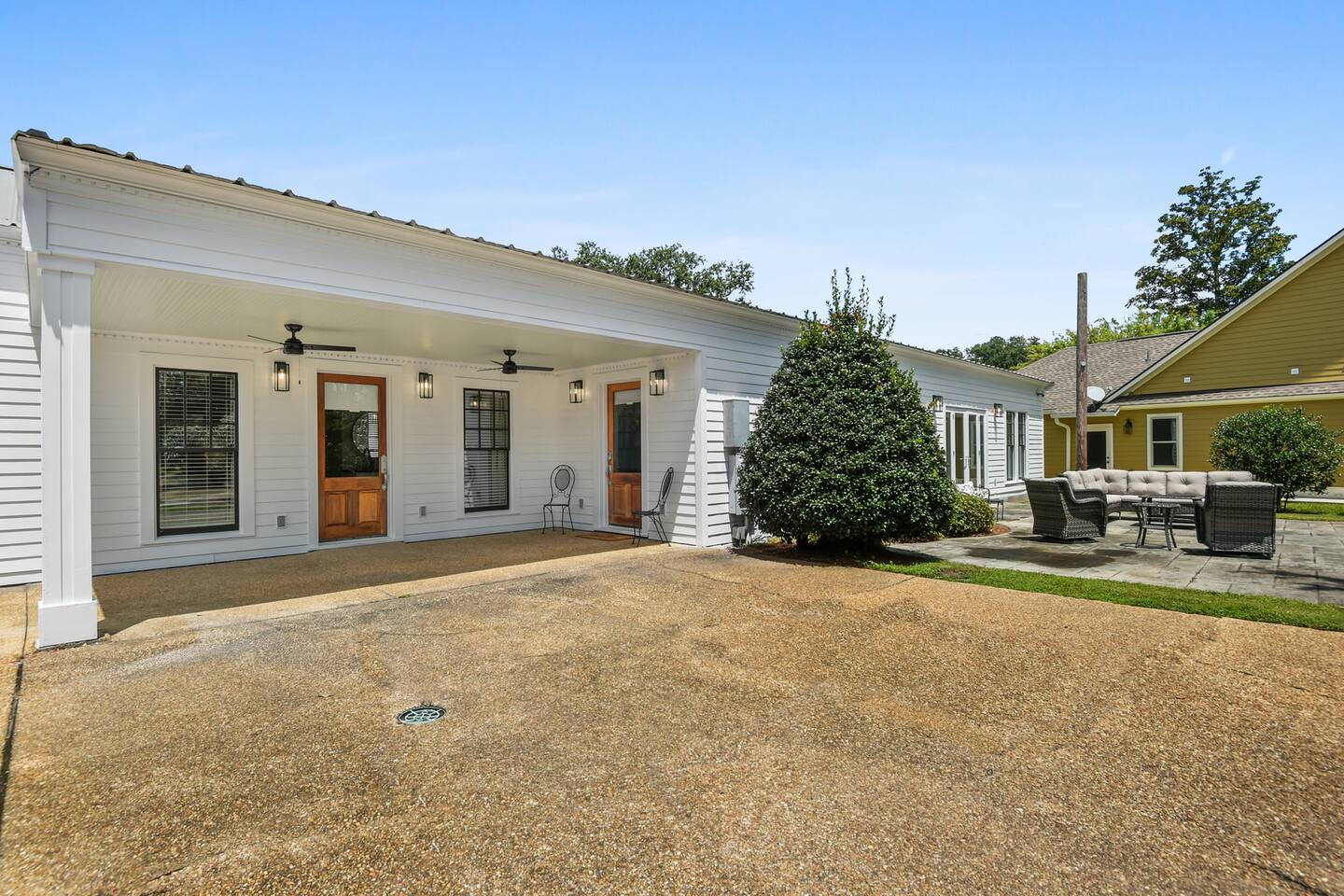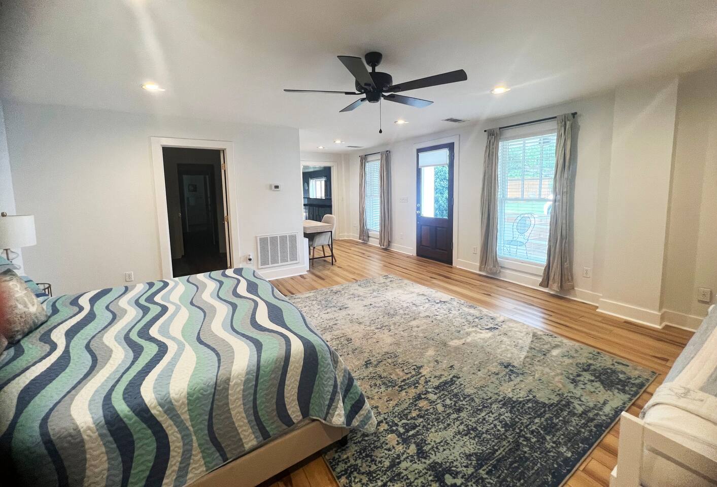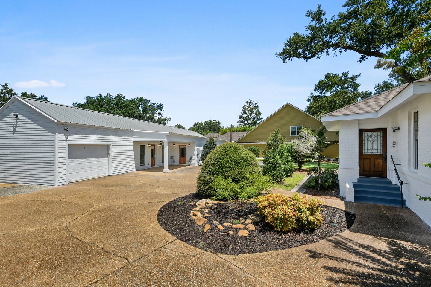 Guest can access the main house from the front door. The main house is accessed by its front door. Both have smart locks. There is a 1 car garage that may be available.