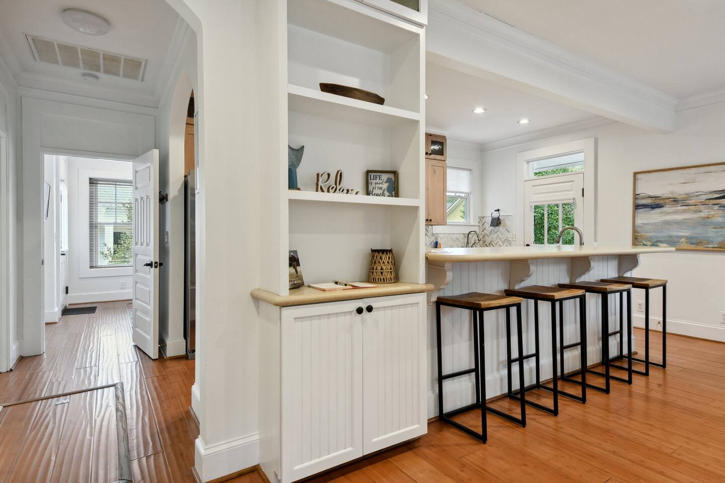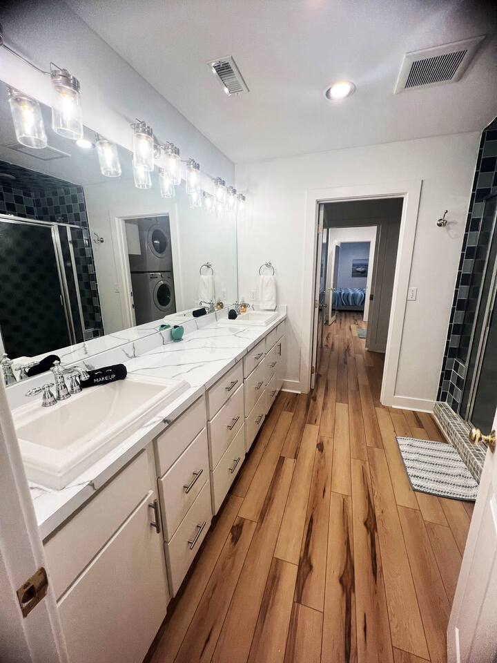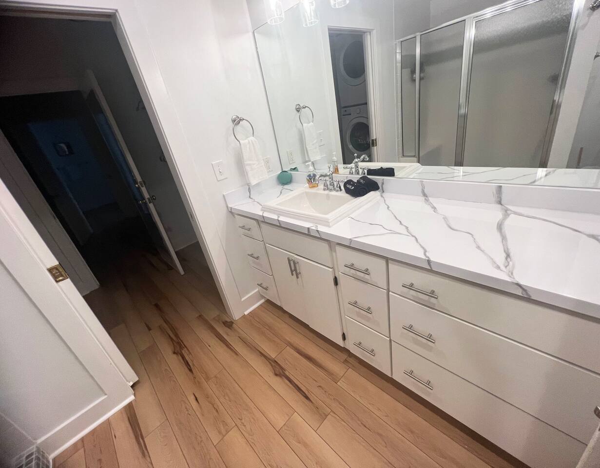 There is a keypad on the front door and one on the guest house door where the “Yay You’re Here” welcome mat is located. You may unload your car wherever you see fit. There is street parking and you can easily pull behind the house, on the left side of the guest house or in the driveway to park. Please do not ever obstruct the neighbors adjoining driveway for any reason. Thanks in advance!