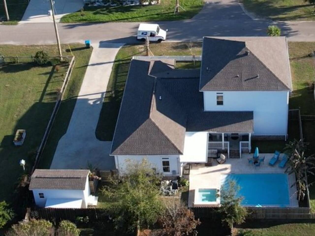 Enjoy a new construction home (2020) w/ beautiful finishes, beach views, pool/hot tub & outdoor area 1 block from the beach & a close to downtown!! 3 King bedrooms (main/master is located on first level of the home), 1 Queen bedroom, along with a Full size bed/seating area at the top of the stairs (with easy access to restroom) and 2 twin beds in the smallest room downstairs. Beach/Water views are seen throughout the home & on the viewing decks, easily walkable to the beach just one block away