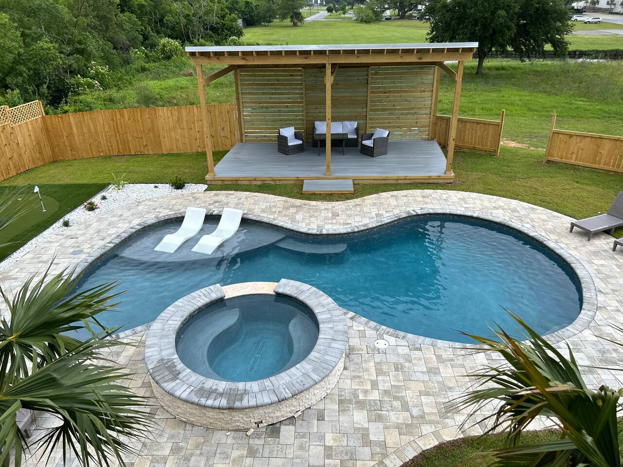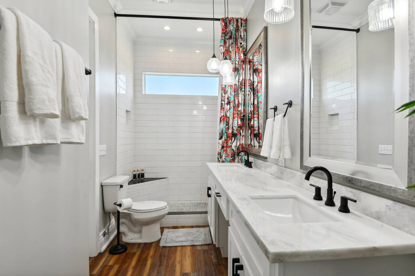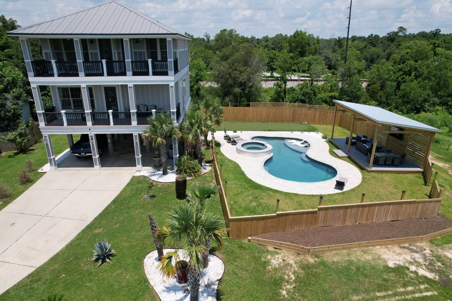Enjoy easy access to everything in this NOLA style 4 BR, 4 bth just 2 blocks to the beach on a quiet cul-de-sac w/ parking for up to 5 vehicles. Each bedroom has an en-suite bathroom, tv, and walk in closet. Heated pool and spa available all year. Work space in laundry area with a tv you can usb connect to your computer for dual monitors or a quiet space to work. 2 large porches for enjoying coastal breezes…80’s style game room! Perfect place to unwind with pool and spa.