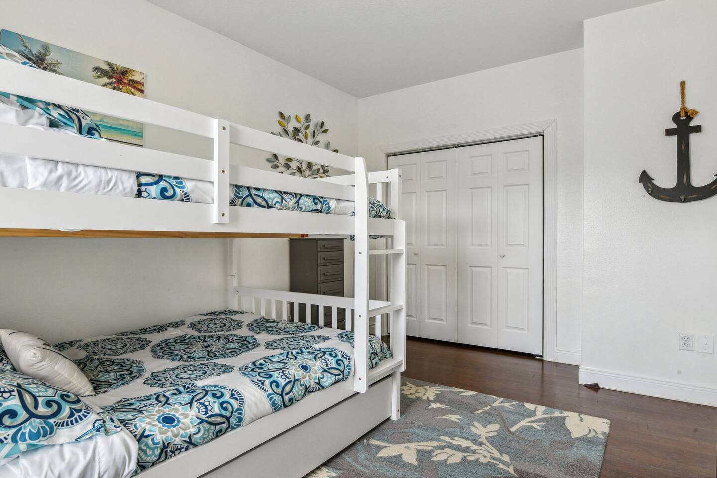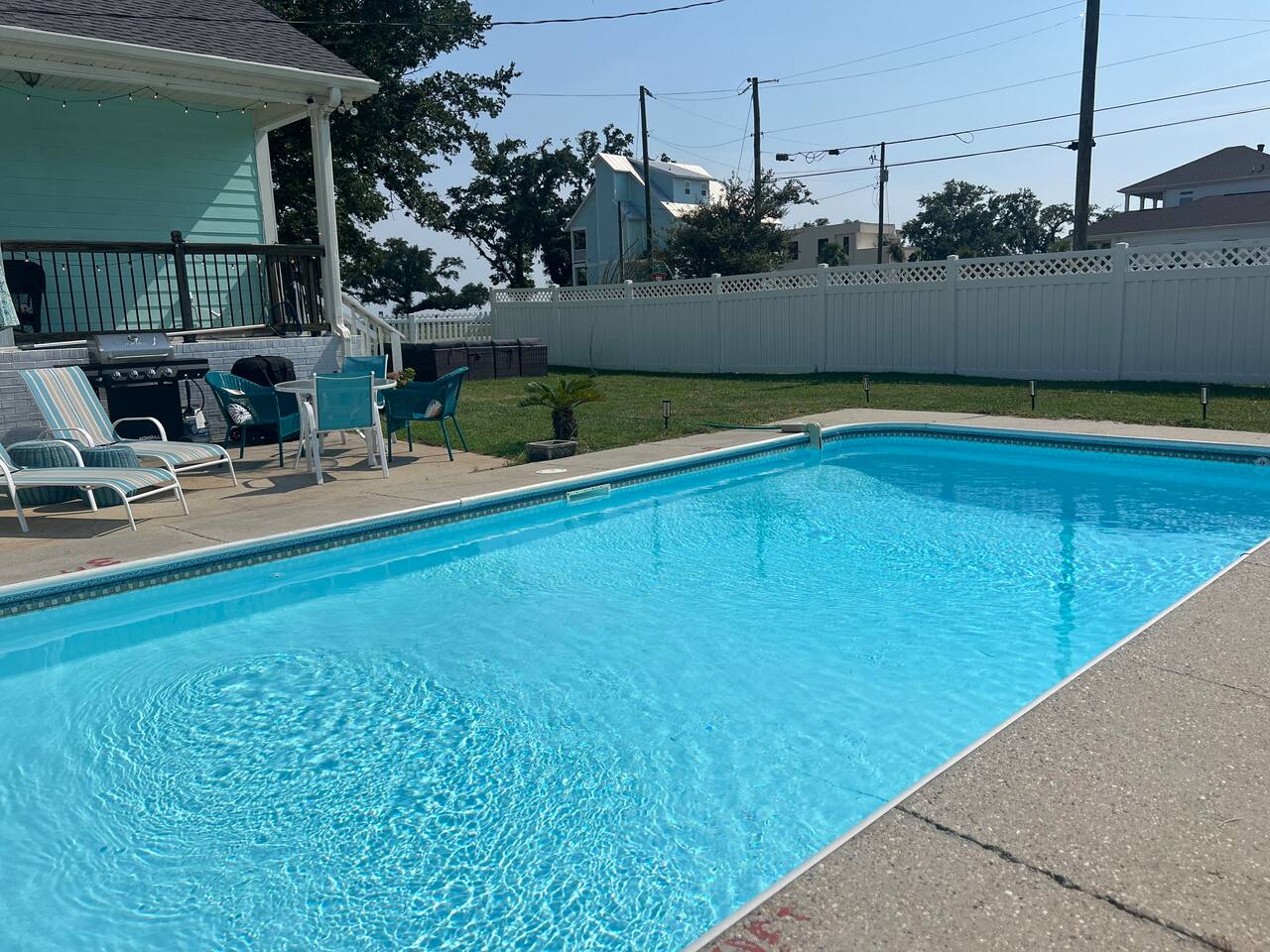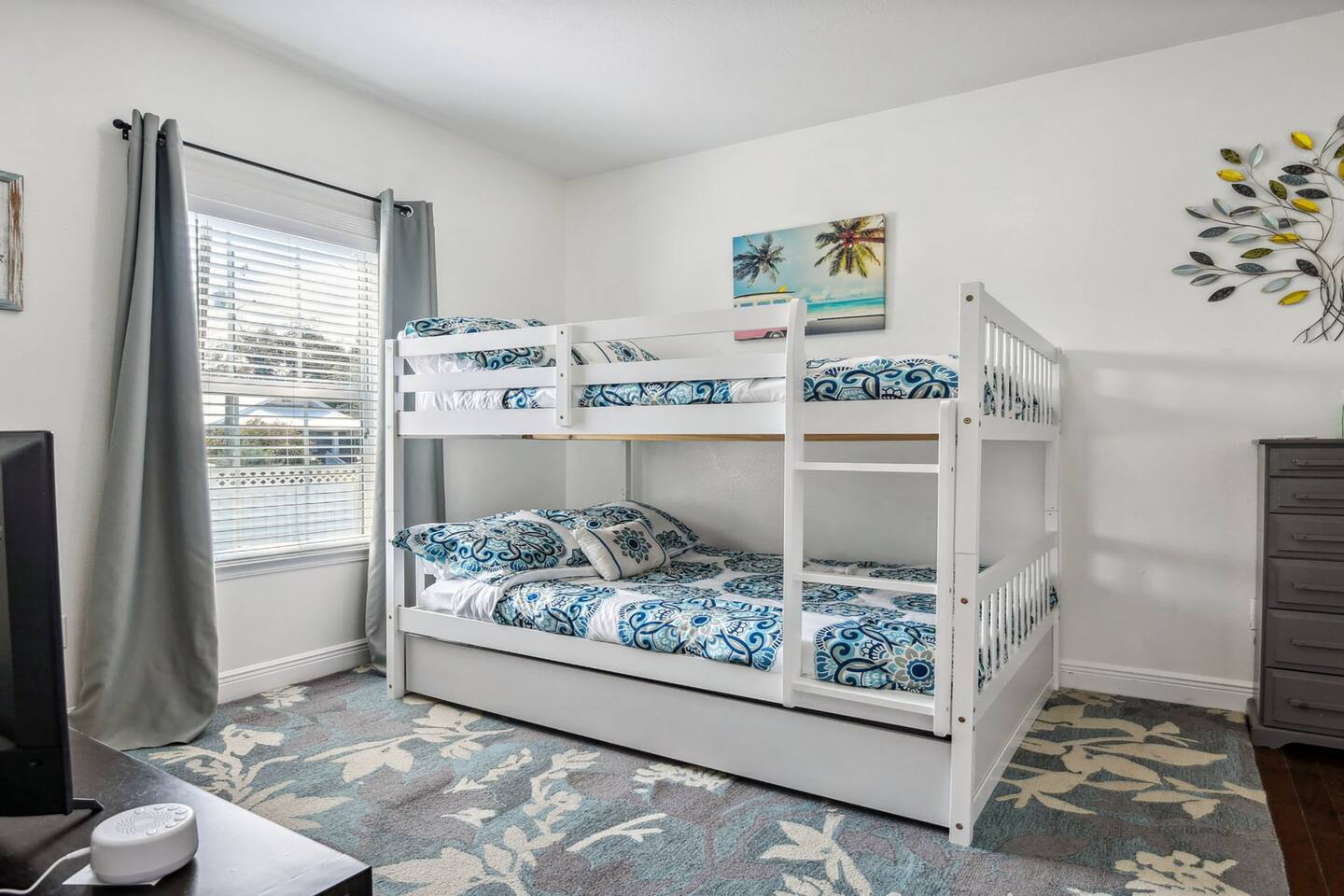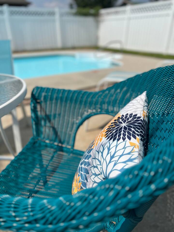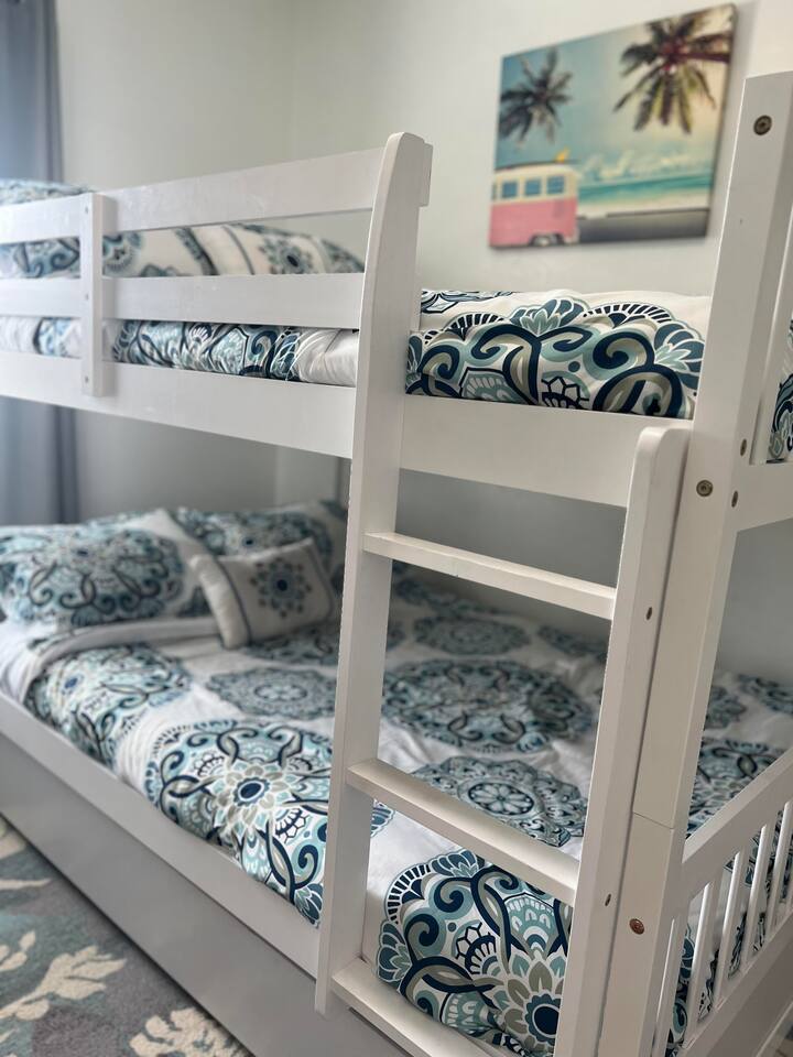 The property features a primary suite on the east side of the house equipped with a king bed and a twin bed perfect for a smaller child in the same room, if preferred. 2 private bedrooms on the west side of the home include a queen bed in one bedroom and 2 full bunk beds in the other with a pull out twin trundle underneath the bottom bunk. The spacious living room and kitchen are in the middle of the home equipped with all you'll need for a lovely stay. Step out back to a beautiful pool area. The pool is heated in the cooler months, so you'll be able to use it year round.