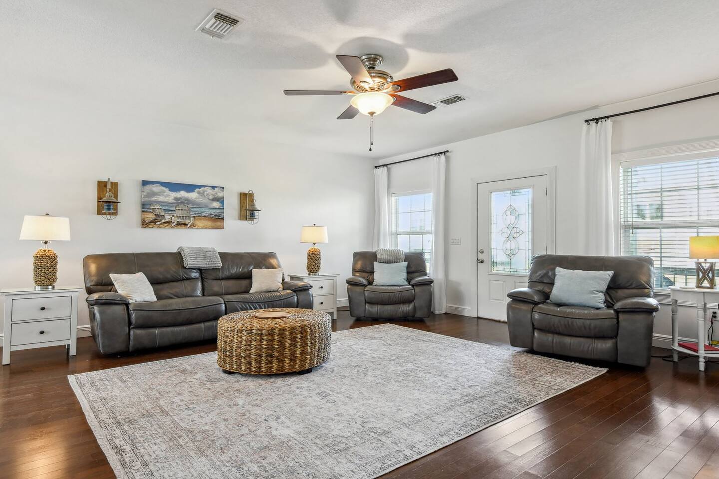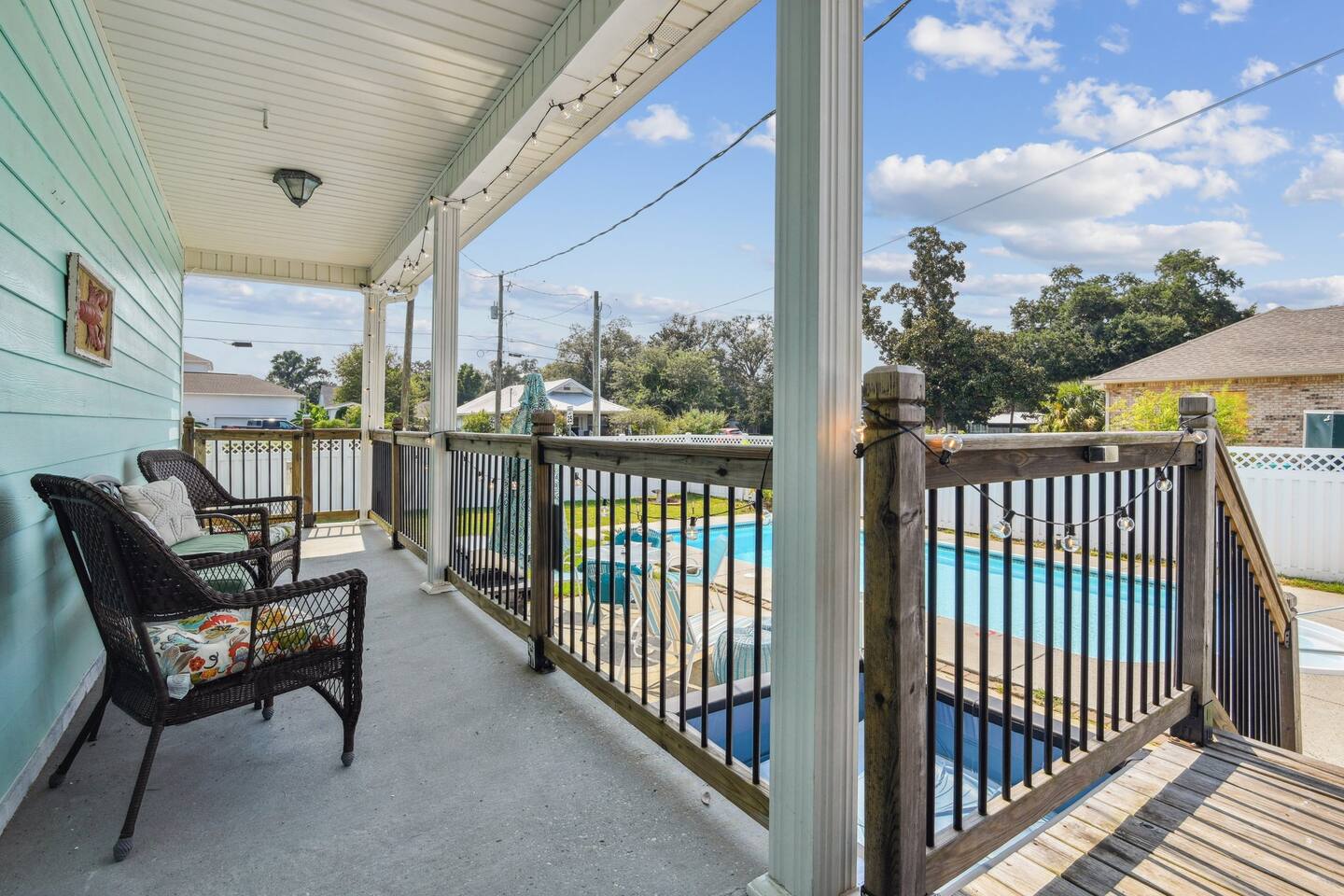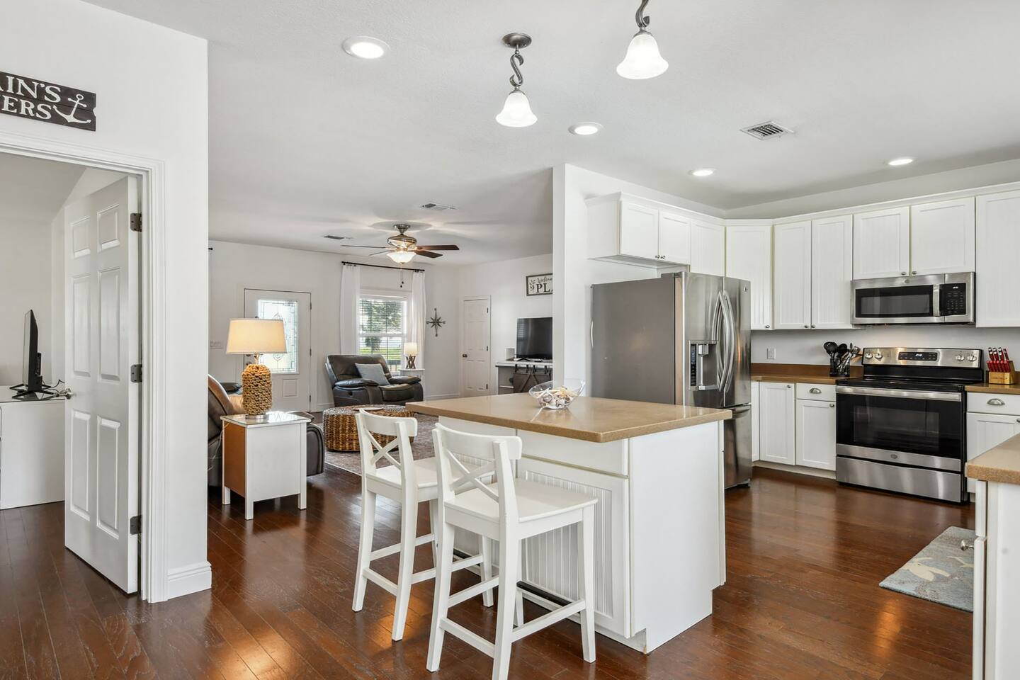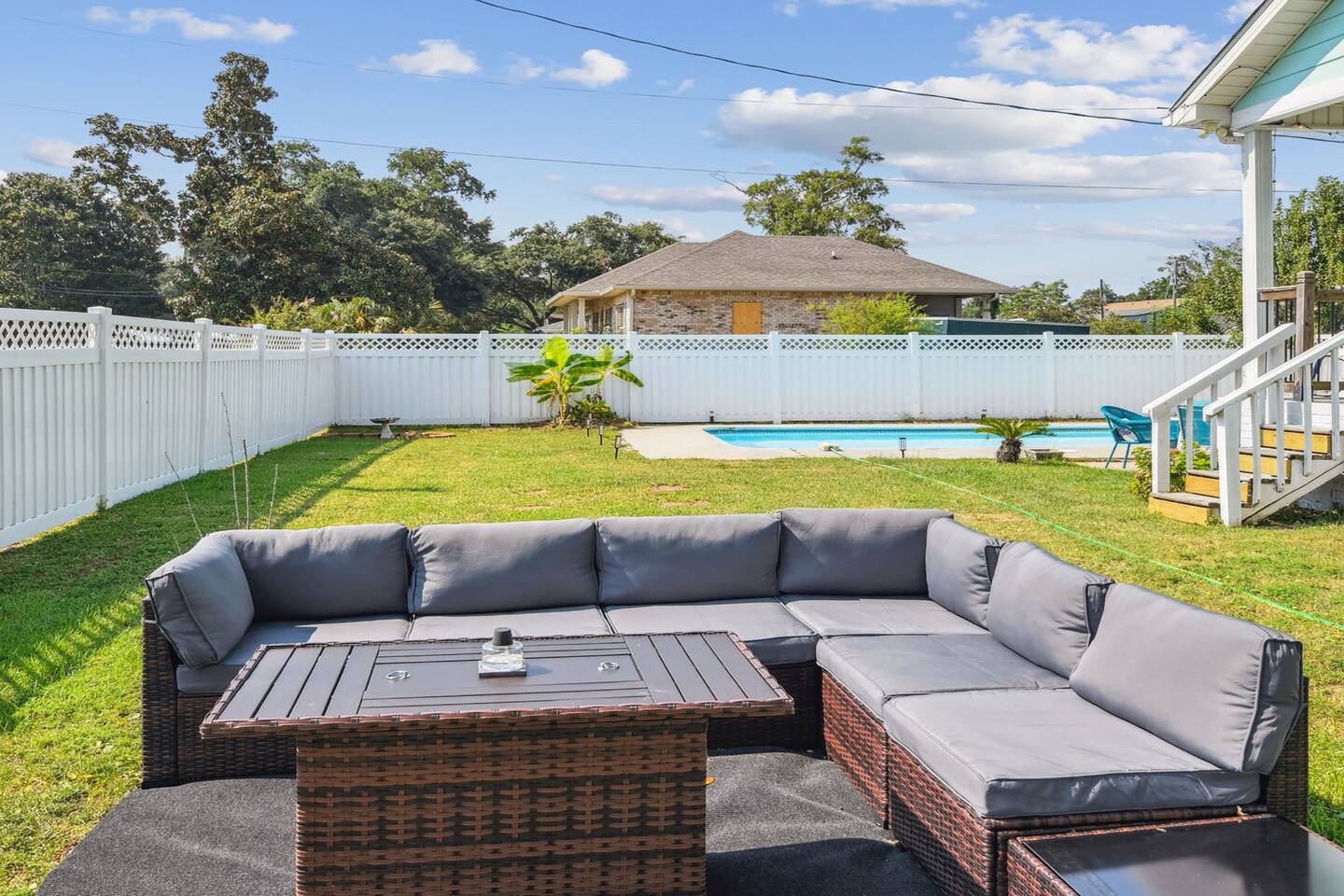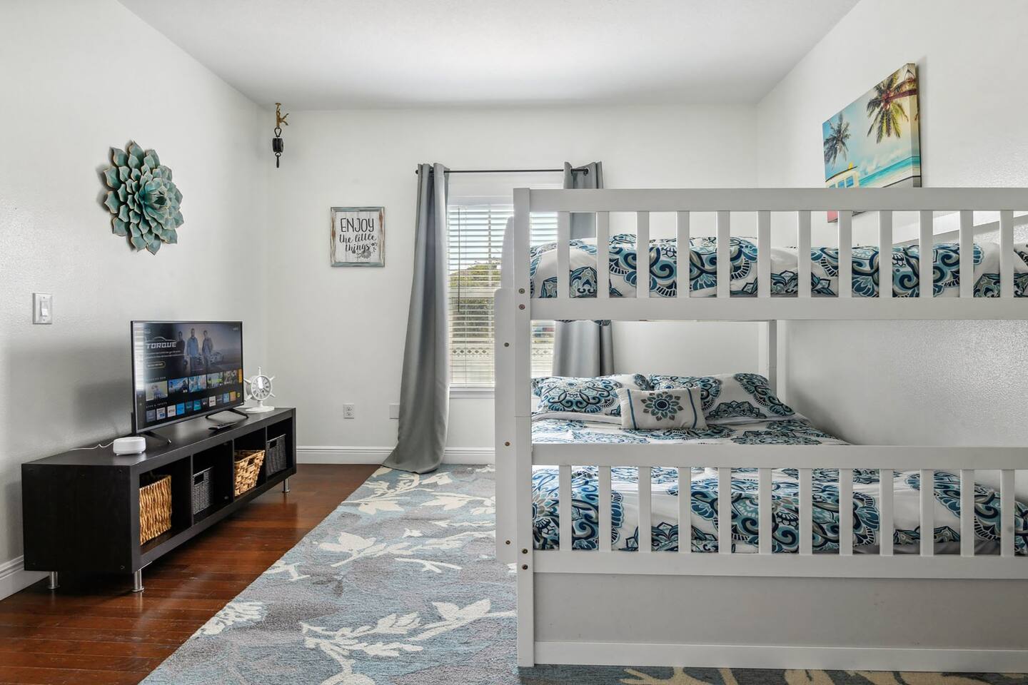 The property features a primary suite on the east side of the house equipped with a king bed and a twin bed perfect for a smaller child in the same room, if preferred. 2 private bedrooms on the west side of the home include a queen bed in one bedroom and 2 full bunk beds in the other with a pull out twin trundle underneath the bottom bunk. The spacious living room and kitchen are in the middle of the home equipped with all you'll need for a lovely stay. Step out back to a beautiful pool area. The pool is heated in the cooler months, so you'll be able to use it year round.