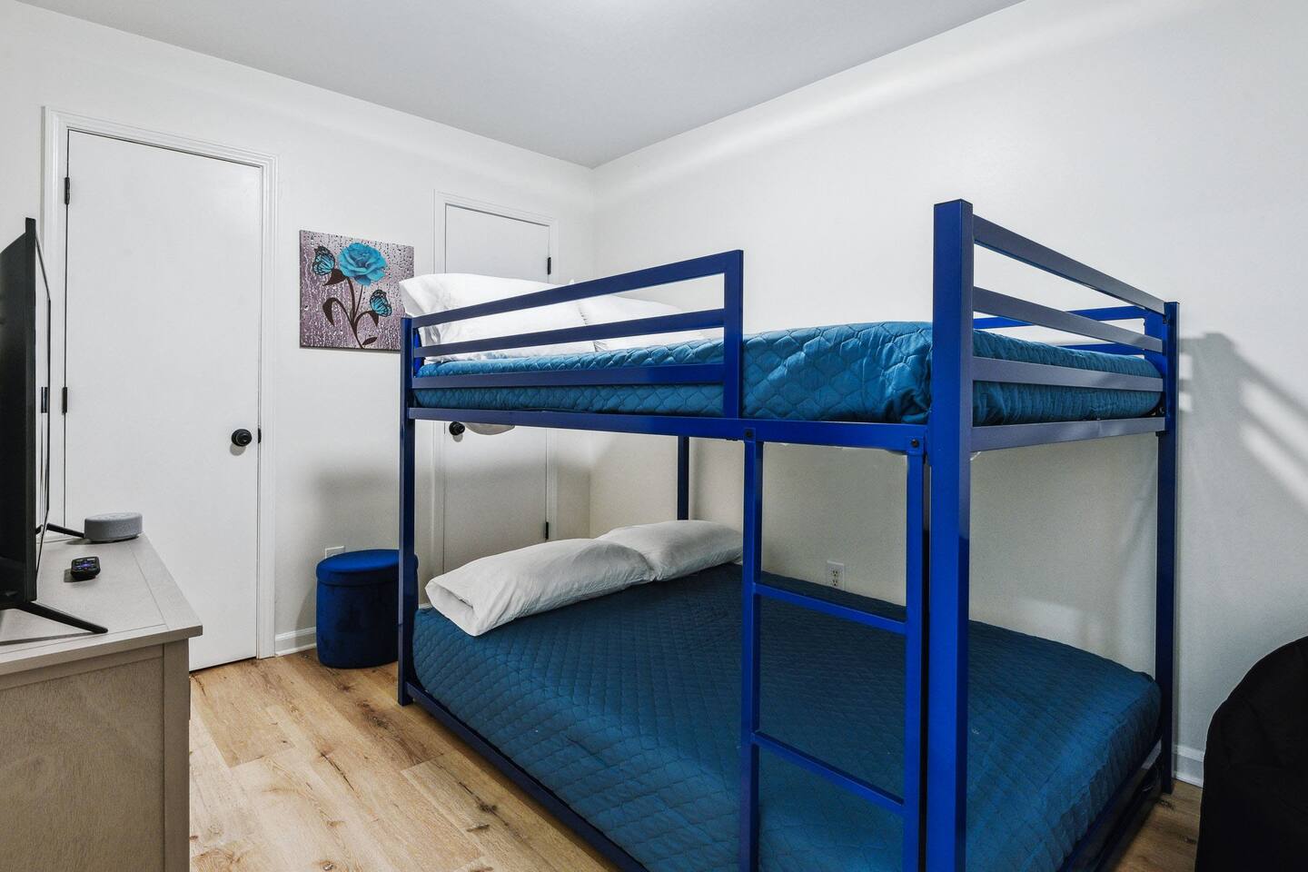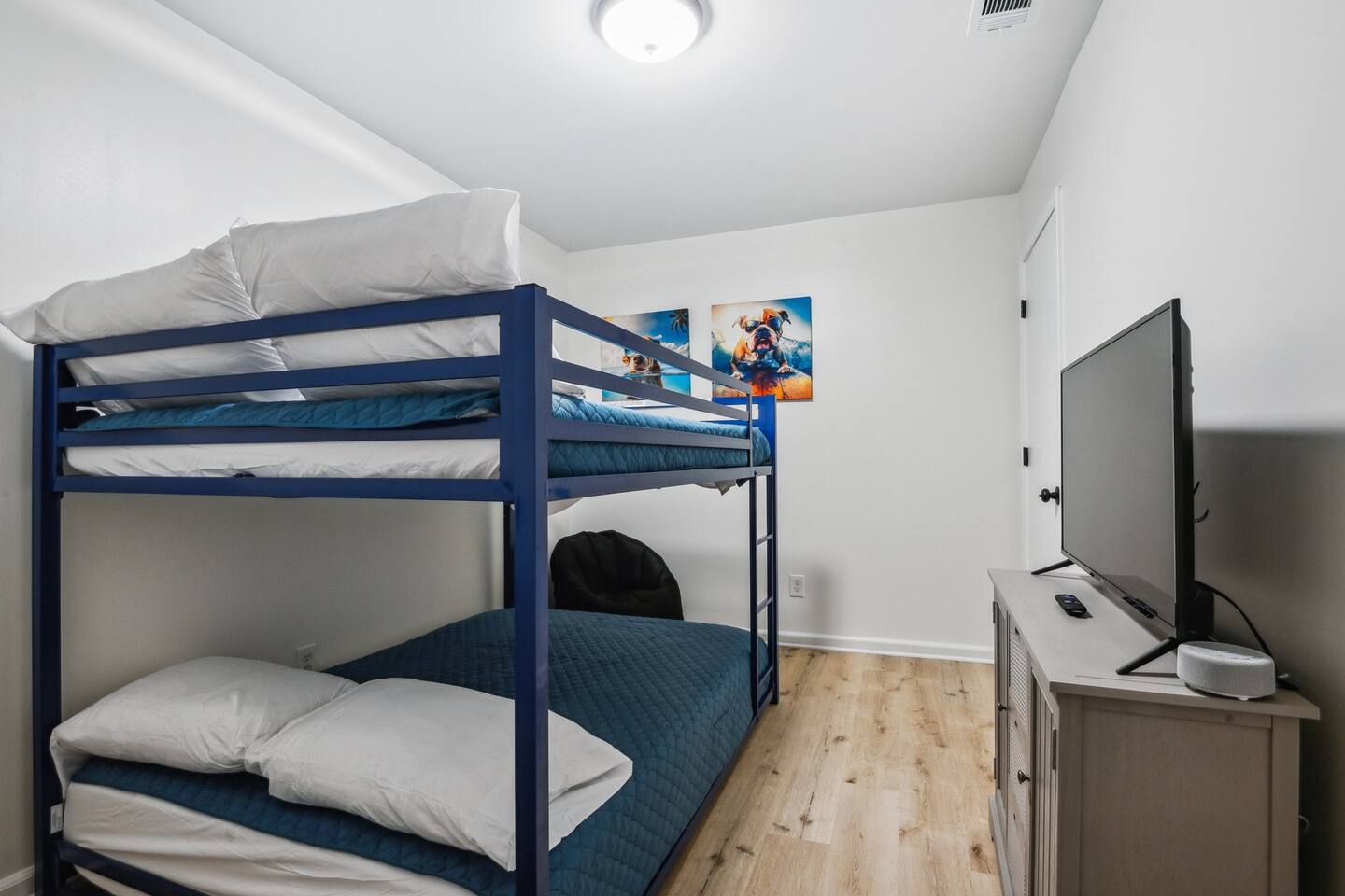 One of the bedrooms has bunk beds with full size mattresses. Fine for 4 children, not ideal for 4 adults. There are a couple of steps down into the living room.