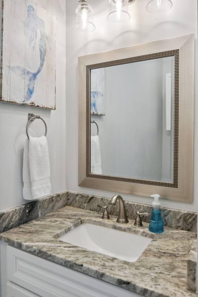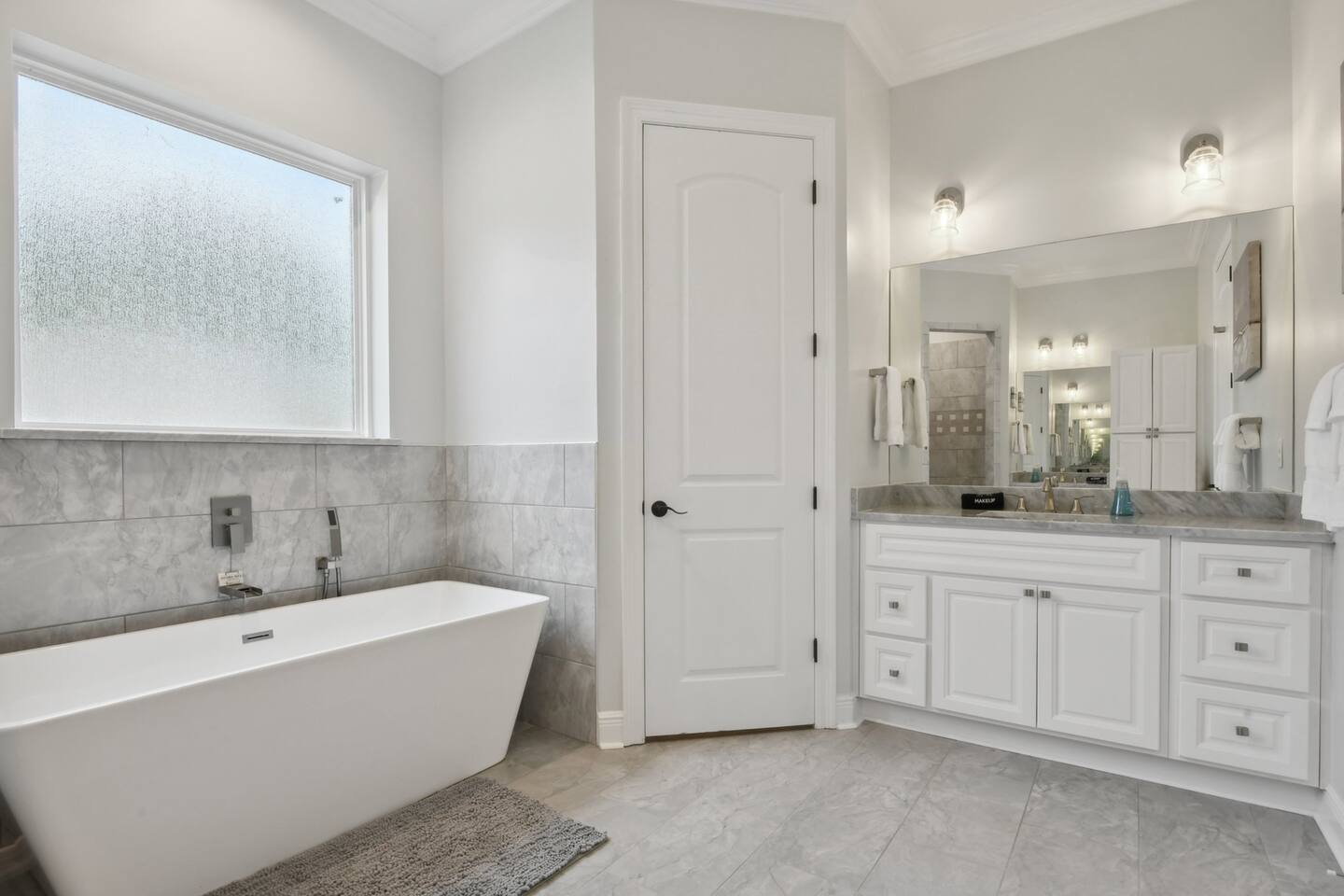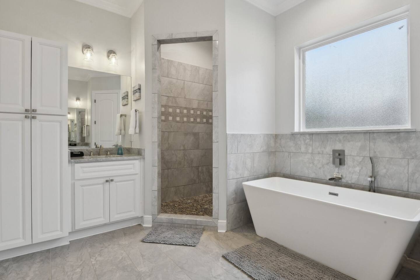 There is a king bed in the primary suite downstairs along with a large bathroom that includes a shower and separate tub. Upstairs there are 2 bedrooms with king beds that share a bathroom that has a shower tub combo. A beautiful heated pool and spa along with an outdoor seating area have been added to the side yard since the original photos were taken. Photos of this area are provided.