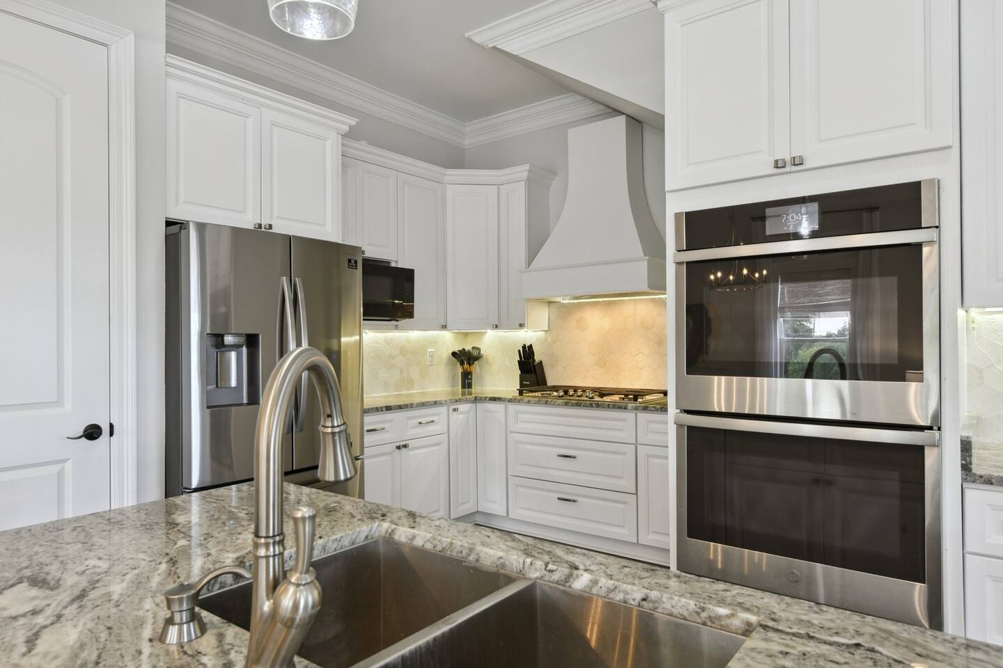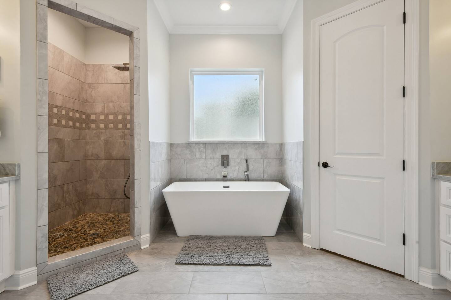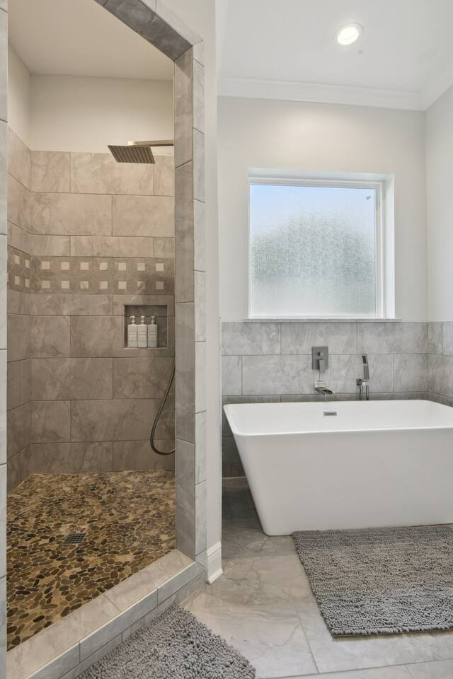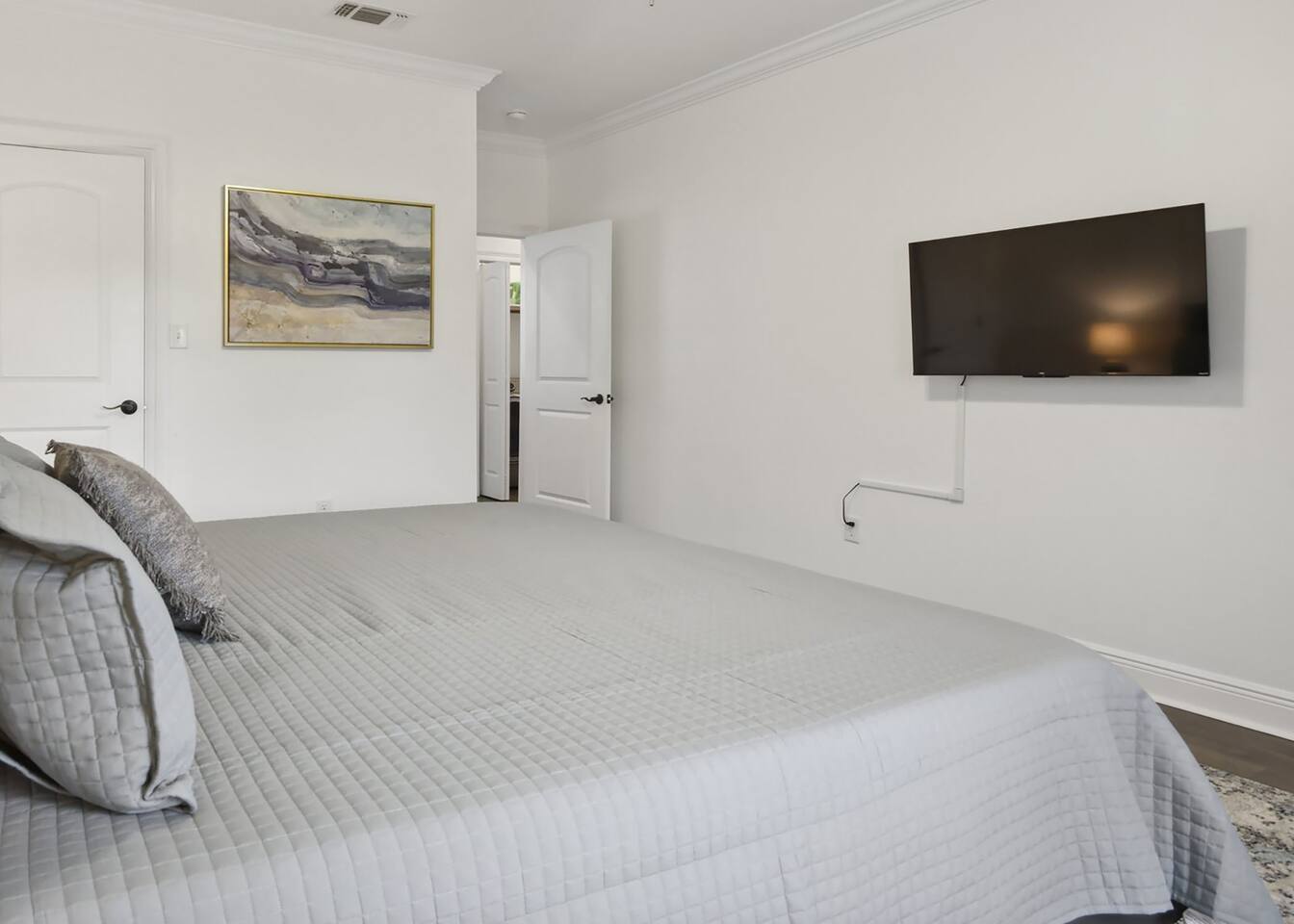 There is a king bed in the primary suite downstairs along with a large bathroom that includes a shower and separate tub. Upstairs there are 2 bedrooms with king beds that share a bathroom that has a shower tub combo. A beautiful heated pool and spa along with an outdoor seating area have been added to the side yard since the original photos were taken. Photos of this area are provided.